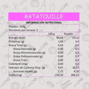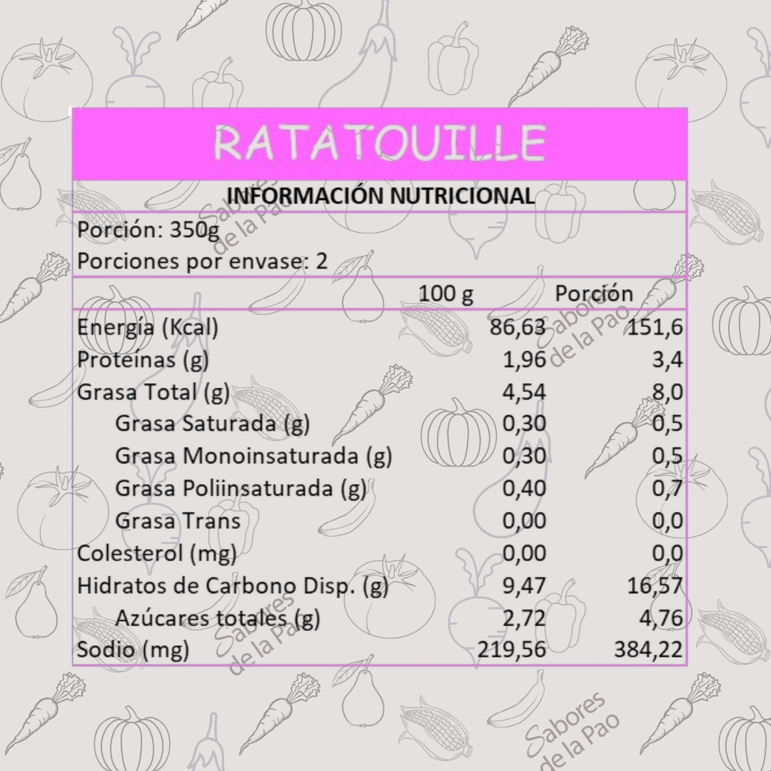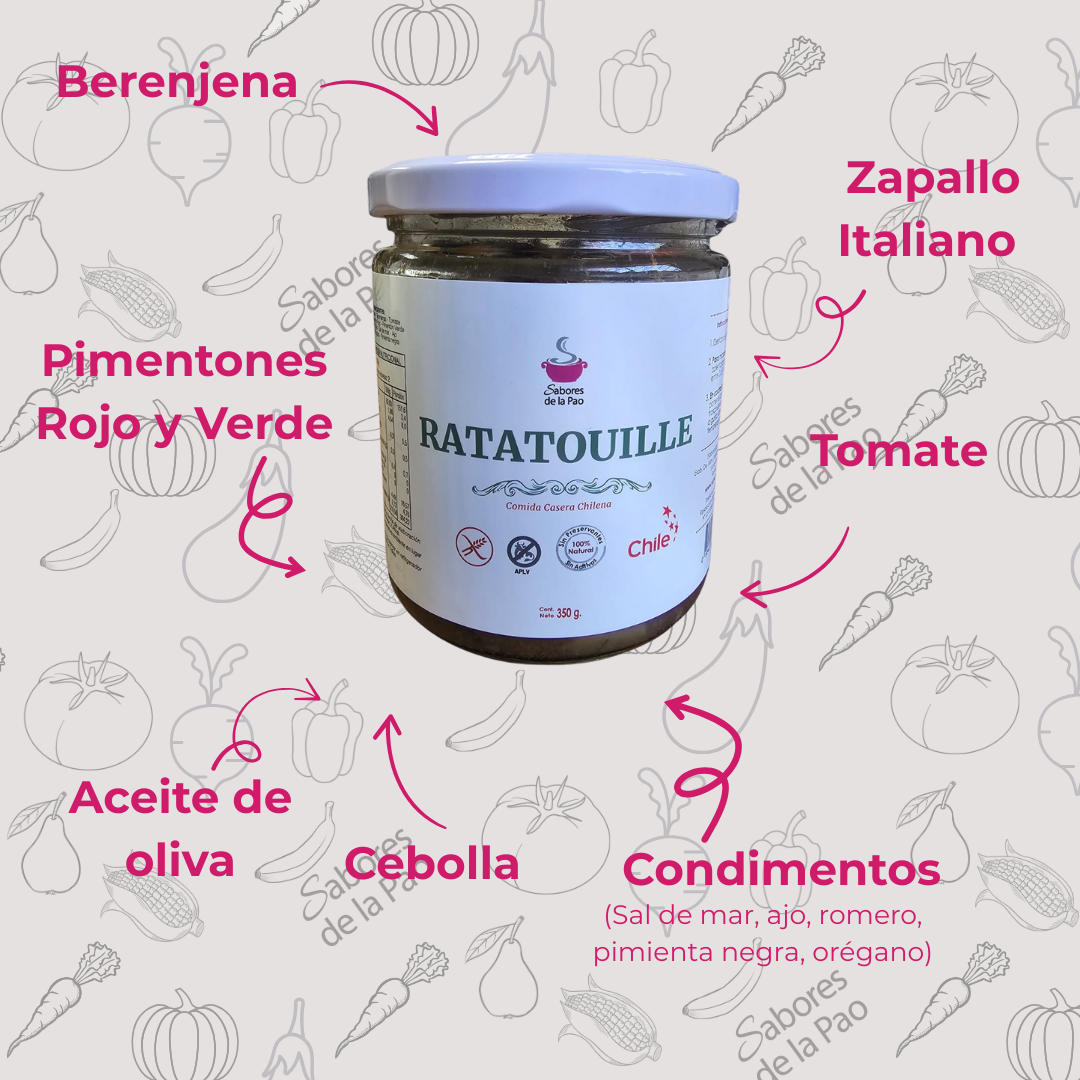 Zapallo italiano, Berenjenas, Tomate, Cebolla, Pimentón Rojo, Pimentón Verde, Aceite de Oliva, Sal de Mar, Ajo, Romero, Orégano, Pimienta Negra.